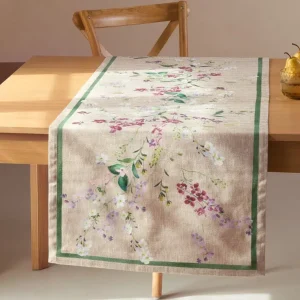 Pas besoin de centre de table, les fleurs de ce chemin de table apportent leur lot de gaité et de couleurs à votre repas. Avec ses teintes naturelles et son dessin fait main, il a le don de sublimer toutes les tablées. Son petit plus : son traitement déperlant, pratique au quotidien. Chemin de table imprimé placé floral sur un fond effet lin.