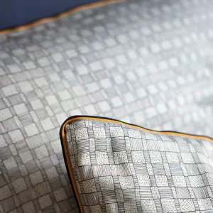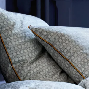 - Taie d’oreiller : Imprimé bicolore sur deux faces, finition galon tissé tricolore: marine, orange et gris