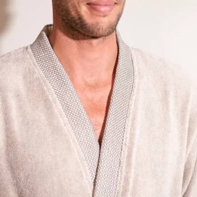 Peignoir homme coloris café chiné, forme kimono, 2 poches.