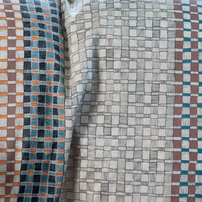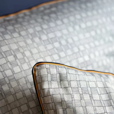 Imprimé bicolore sur deux faces, finition galon tissé tricolore: marine, orange et gris