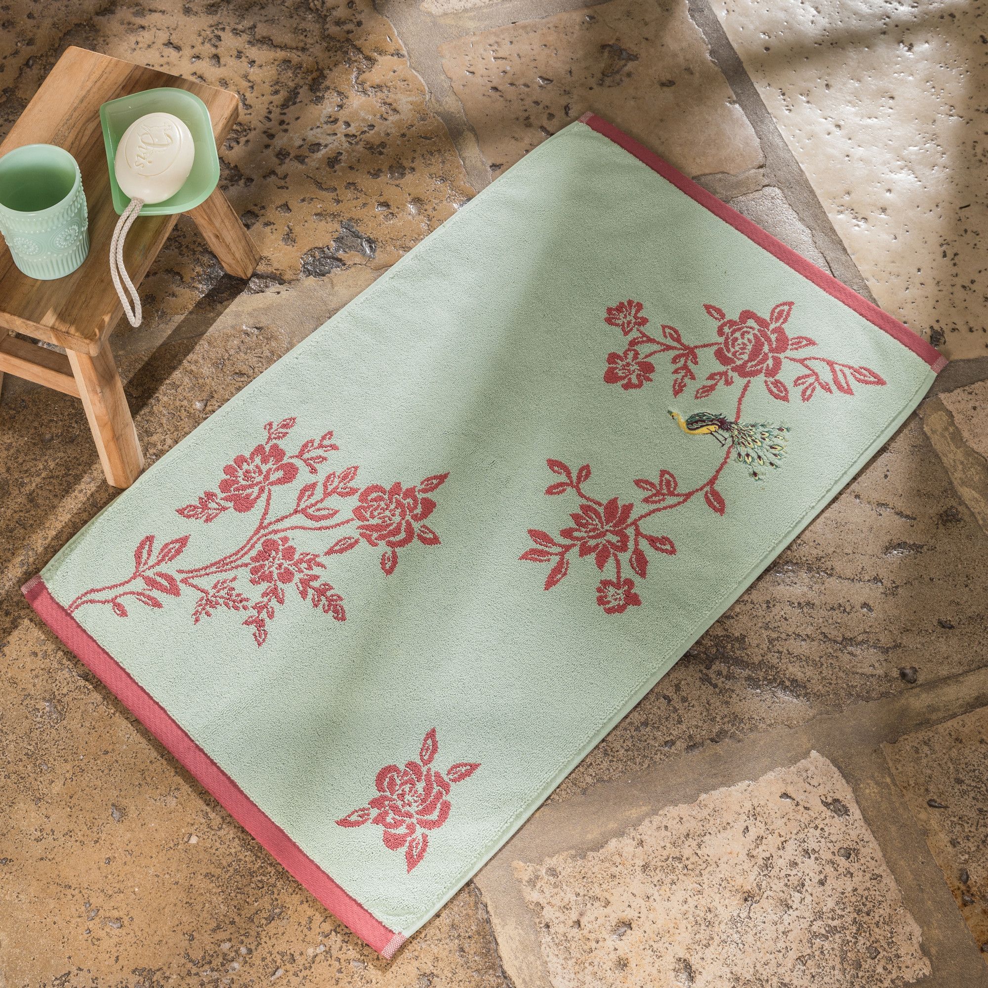 Caractéristiques Tapis de bain GoaInvitez l’esprit bohème dans votre salle de bain avec le tapis de bain Goa, une création inspirée des splendeurs de la Route de la soie.– Ce tapis de bain somptueux marie la richesse des motifs floraux en jacquard et la délicatesse d’un paon finement brodé, pour une touche d’élégance orientale qui évoque le raffinement des traditions artisanales indiennes.